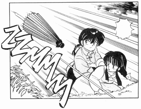Continuing the show of his strength, Ryoga manages to launch himself and Ranma into the air with his one free arm. While is the air Ryoga spins Ranma back round to face him and tries to kick Ranma, but Ranma dodges the kick and is able to spin over Ryoga and break free of Ryoga's bandana. Ranma then proceeds to kick Ryoga, sending him flying and narrowly miss the crowd of students and land on the surrounding grass. Ranma then comes in for another attack, but Ryoga kicks the area in front of Ranma making him flinch just long enough for Ryoga to roll over and grab his Umbrella.