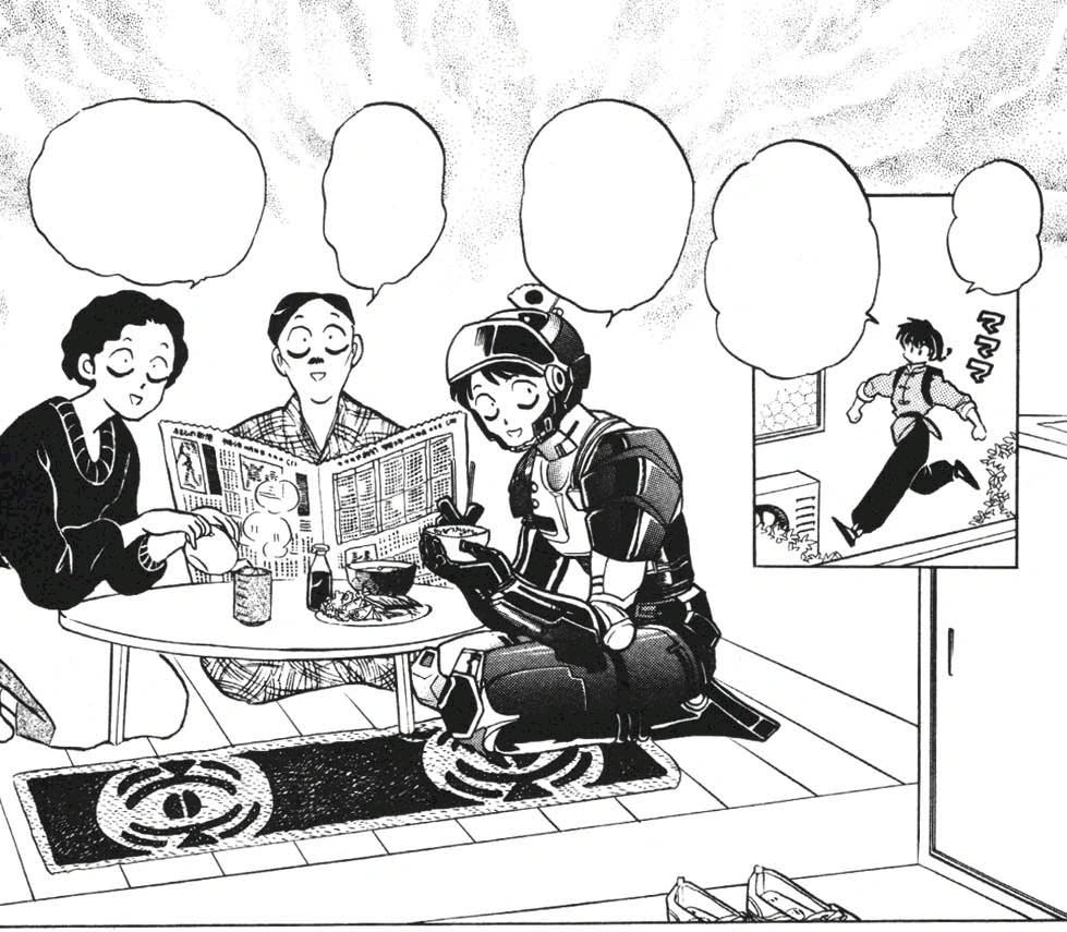 Gosunkugi continues to explain to Ranma that if he doesn't punch his strongest opponent once the lock stays on and he can't remove the suit. Ranma then hits Gosunkugi in the back of the head and says that's a though break, Ranma then continues to ask Gosunkugi is this means he's his strongest rival. Gosunkugi replies yes and tells Ranma he's as quick as ever. Gosunkugi then releases a chain from the arm of the suit and is able to stand up finally, much to delight of his parents. Once he stands up, Gosunkugi punches table in front of him, this leads Gosunkugi to deduce that the suit waits for the enemy to come into range; it then latches onto them and powers up. As he says this Gosunkugi's parents are glad their son finally grew a backbone and is now practicing martial arts.