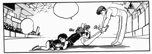 As the Announcer declares that Furinkan High School has sent in a substitute pair, Ryoga and Ranma begin arguing to each other about why the other is here. Mikado and Azusa look on and Mikado recognises the pigtailed girl from the Skating Rink where he kissed her and she ran away in happiness at being kissed (although Ranma quickly hits Mikado on the head saying that those are lies).