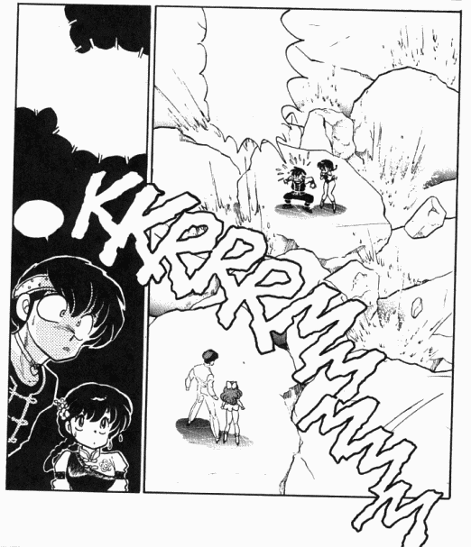 Ranma returns to Ryoga and slaps him while asking him how long he plans to lay there. Ryoga angrily punches the rink, causing a crack to appears, he continues by saying that only if the ice wasn't there he could win. Ryoga then punches the rink again, this time causing a spray of water to come jetting out and spraying Ranma. As the two look at the water spouting out, Ranma notes that the rink is created by freezing over a swimming pool. Ryoga unhappily asks why he wasn't told his sooner, just as the rest of the rink begins to break into large chunks.