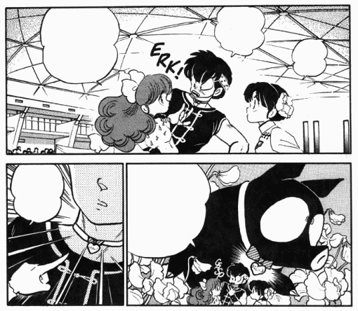 Mikado tells the pigtailed girl he's delighted to see her again, to which Ranma retorts that they should get back to the match. However, Ryoga tells Ranma that he's in no condition to fight and choke holds Ranma trying to make her agree so Ryoga can partner with Akane instead (who's at the side of Rink looking on at the events). The crowd then begins to get restless about the change in pair (which turns out that they're most upset about the girl's outfit not being sexy at all), the Kolhotz High Fashion Club then steps in and take Ranma and Ryoga into separate booths. The pair then re-emerge in their new outfits.