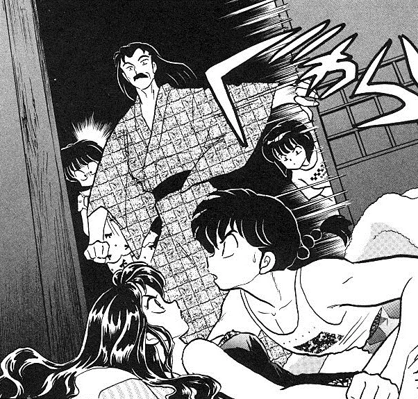 Before they head to school, Hinako takes out her coin so she can say goodbye to Soun in her proper form. She starts chasing Ranma for his energy while Soun is in another room thinking about his late wife. When Ranma runs into the room, Hinako accidentally ends up draining Soun instead. Her delicate treatment of weakened Soun is observed by Ranma and the Tendo sisters, who were becoming weary of her presence.