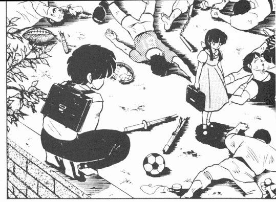 Nabiki is then seen talking to her friends from a balcony of the school. Nabiki then spots Ranma and shouts to him telling him to get into the school now, Ranma then points to the fight between Akane and the other men, Nabiki then says not to worry about Akane. But Ranma looks down and sees Akane has defeated all of the group. Akane then says it's a drag having to fight them every morning. A voice then calls out and describes them as a truly boorish lot.