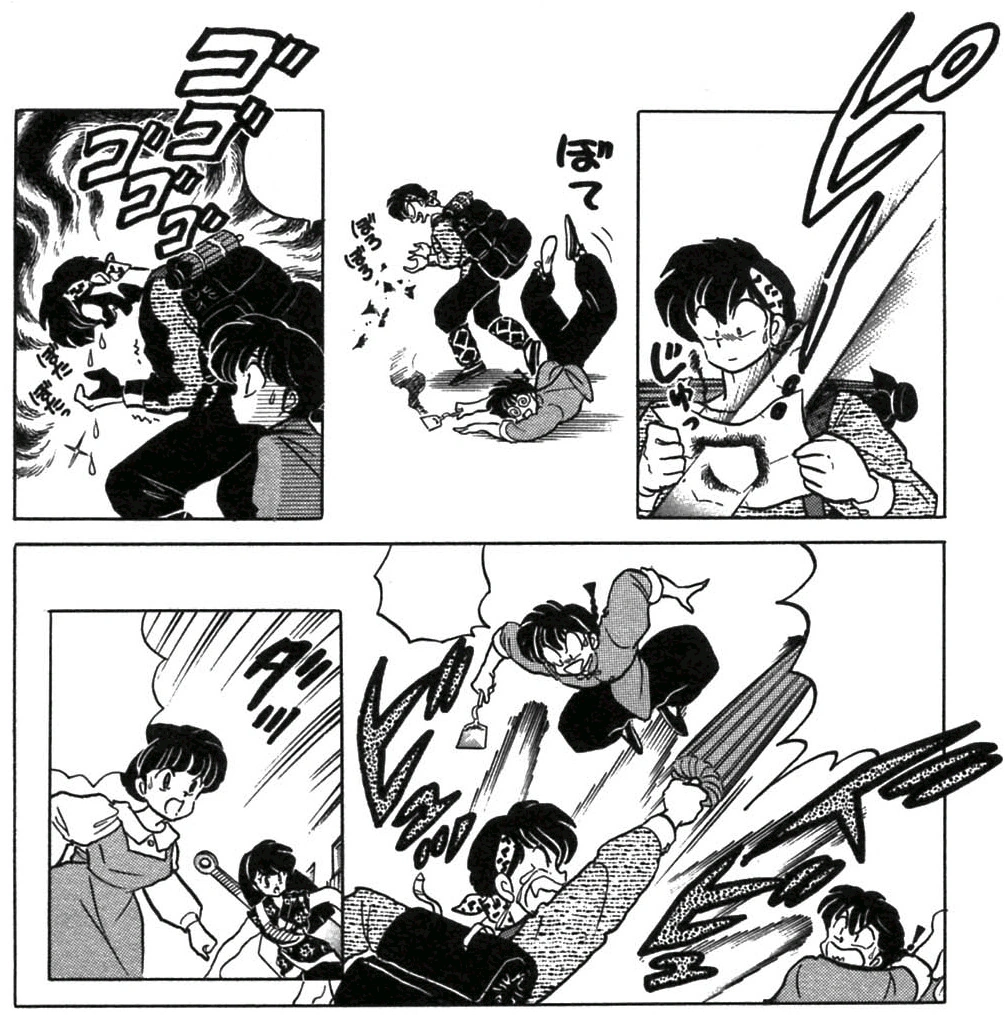 Just then Ukyo and Akane catch up with Ranma. Ukyo quickly puts some Okonomiyaki batter on Kuno's head and Ranma jumps in an attempt to cook it with the spatula. However, the spatula launches another laser beam, only this time it hits Ranma and allows Kuno with an opening to hit him with his Bokken. With Ranma gone, Kuno turns his attention to Akane and asks her is they can share a fiery encounter. This angers Akane, who kicks Kuno into the air.