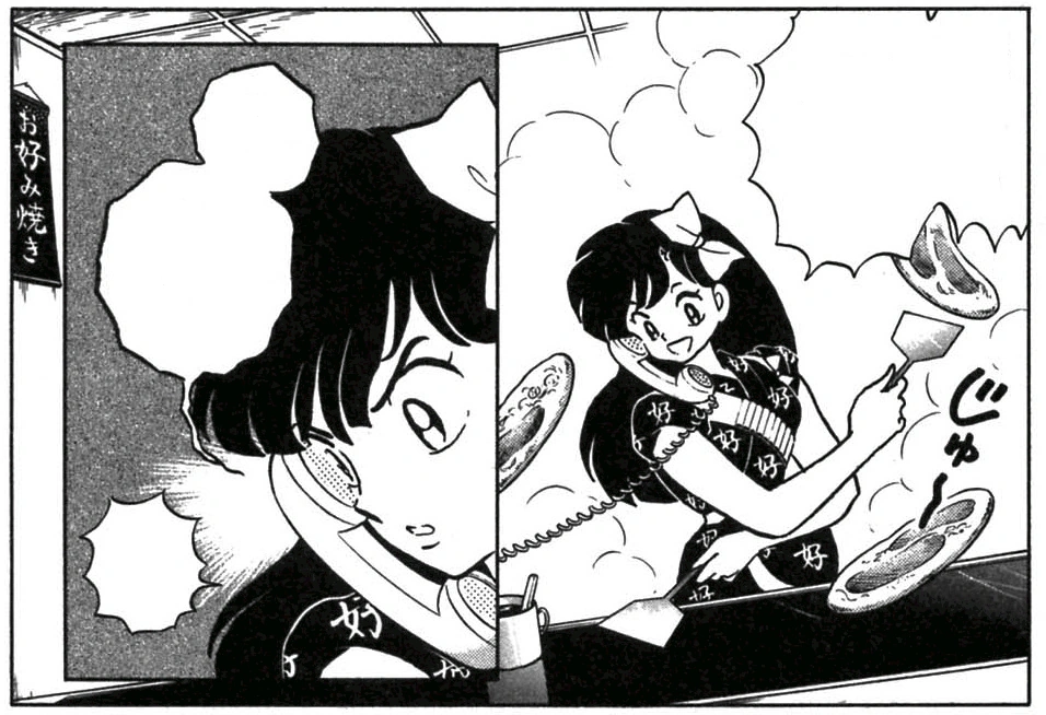 The spatula then becomes angered and launches another laser beam, this time hitting the batter and severally burning Ryoga (who inadvertently acts as a human shield to protect Akane). As Ryoga collapses, Ukyo notices a smell and uses her giant spatula to catch the Okonomiyaki that's hurtling towards her and Akane.