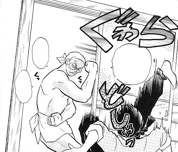 He becomes blushed as he tries to tell her that he's willing to look at her breasts, but before he can get the proper words out, his father bursts out of the bath posing for his son and telling him that he's more than welcome to look. (Breast and Father sounds similar in Japanese) Ranma is taken aback and hits Genma shouting he wants to see Akane's breasts, not him. He is crushed when a washing machine is thrown at him from behind. He turns around to see Akane with a bandage over her head and an imprint behind her. Ranma apparently rammed her with the door when he came to the laundry room. She calls him a pervert and beats him.