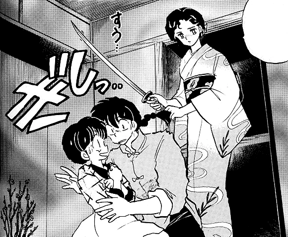 Confused Ranma tries to piece things together, noting that they're quietly in a dark room alone. Akane assumes that Ranma knows what is happening and tells him to hurry, implying he should leave the room immediately. He takes this the wrong way and hugs her tight, erroneously assuming that Akane went through all this effort so they can make up. Akane is confused then disconcerted as Ranma moves his face very close to hers, but soon comes to her senses and yells at him for not understanding. Suddenly Ranma sees a sword over his shoulder. Nodoka tells him to turn around slowly.