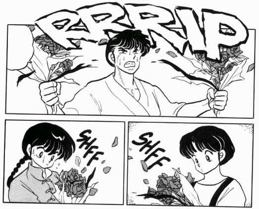 Kuno splits his Rose bouquet in half when he can't chose between Akane or the pigtailed girl.