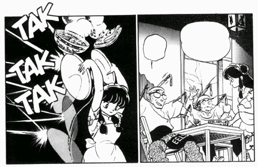 Shampoo's Great-Grandmother then throws several sharpened chopsticks at Shampoo, who manages to block them with the plates she's carrying before the food on them gets anywhere near the ground. As the two men are stuck to the wall with the deflected chopsticks, Shampoo's Great-Grandmother asks them if they want Shampoo to compete (at which point Shampoo adds that a easy-to-win race is fun for her). In response, the men tell Shampoo's Great-Grandmother not to worry as their delivery girls are no slouches.