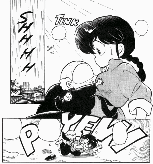 Just then a freak rain storm occurs and ends up turning Ranma into his female form while Happosai was still crying on him. This gives Happosai the opportunity to grope Ranma while she chokes at the smell of the Woman Repellent. With Happosai back to normal he notes that it's payback time, while Ranma shakes in anger at Happosai.
