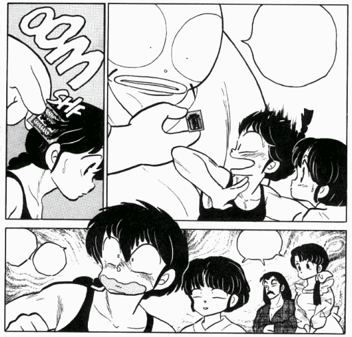 Shampoo takes out another Nannīchuan packet and tells Ranma that this is the last one. Ranma quickly tries to grab it, but Shampoo moves out of the way before she can do so. Shampoo then proceeds to pour hot water over Ranma and tells him that if he wants it then he has to give her one more kiss.