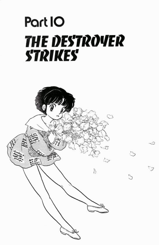 With Ranma's date occurring on the same day as the rematch, Akane decides to defeat the Destroyer herself, but severely damages her hand when she shows off her strength to Ranma.[2] Despite her best attempt,[3] Akane is unable to defeat the Destroyer, leading to Ranma (after securing the powder from Shampoo) to intervene and take the Destroyer on herself.[4]