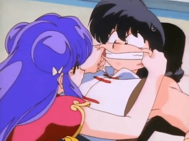 Shampoo plays with Ranma's mouth.