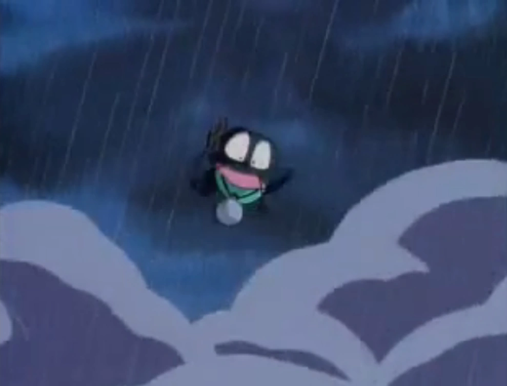 Ranma then asks the Hermit why he only wants revenge on him, which leads the Hermit to a flashback of when he was training frogs at Jusnekyo. The Hermit is training a frog to jump onto different bamboo poles when Genma (who is in his panda form) and Ranma fight underneath him, causing the bamboo pole the Hermit is sat on to be cut in two and the Hermit falls into Chiwanīchuan and thus re-emrge a large frog. Ranma and the Hermit then begin to fight each other again and the Hermit manages to catch Ranma with his tongue and throws his flask of Chiwanīchuan water towards Ranma only for Akane to jump in front of it and get all the water on her. However, the Hermit reveals that the water used to contain water from Chiwanīchuan but there was a leak and all the water spilled out so the frogs of Genma, Shampoo and Ryoga are only frogs and the real Genma, Shampoo and Ryoga are sleeping inside the Temple. The Hermit continues by saying that he only wanted to scare Ranma and he only wanted others to feel his misery since his cursed form is so pitiful. This angers Ranma and kicks the Hermit into the sky and the Hermit says he'll come back when he feels sad again.