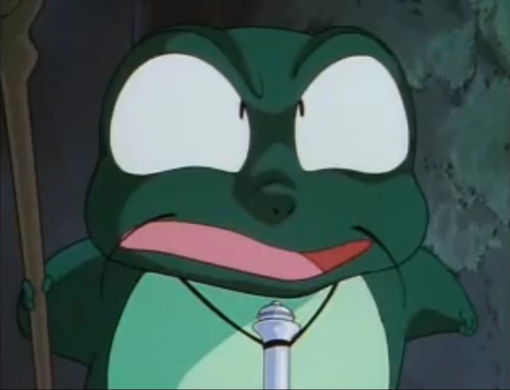 After Ranma, Mousse and Akane go to the Frog Temple and meet up with the Hermit again, who this time has turned into his cursed frog form. Akane is shocked to see that the frog can talk, which the Hermit replies he's not called the Frog Hermit for nothing and that even as a frog he can still talk. The Hermit then summons am army of frogs with knives and grenades to attack Ranma, Akane and Mousse (who is now in his duck form), however the frogs fainted at the sound of the grenades with the exception of Genma, Shampoo and Ryoga frogs which Ranma quickly subdues with a clap of his hands.